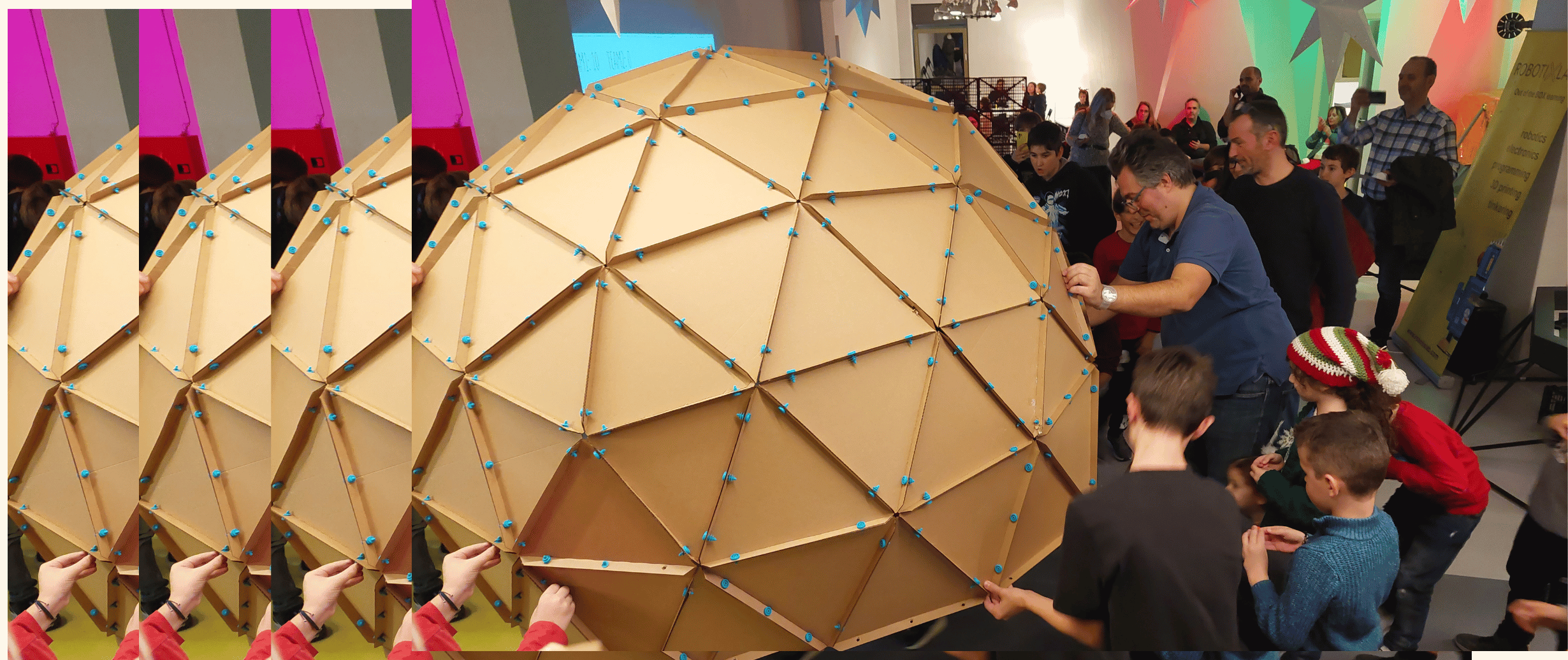 Η εκδήλωση για τα Χριστούγεννα του 2022 στην Robotixlab ήταν αφιερωμένη στον Buckminster Fuller και στο όραμα της συλλογικότητας. Σχεδιάσαμε και κόψαμε με το κοπτικό laser τρίγωνικές επιφάνειες από σκληρό χαρτόνι τις οποίες συνεργατικά, χωρισμένοι σε ομάδες μετατρέψαμε σε πεντάγωνα και εξάγωνα συναρμολογώντας τα μεταξύ τους. Στην πορεία όλα αυτά τα μεγάλα εξάγωνα και πεντάγωνα, βασισμένοι στις αρχές των γεωδετικών θόλων βιδώθηκαν μεταξύ τους δημιουργώντας έναν αυτουποστηριζόμενο θόλο διαμέτρου 3,5 μέτρων
